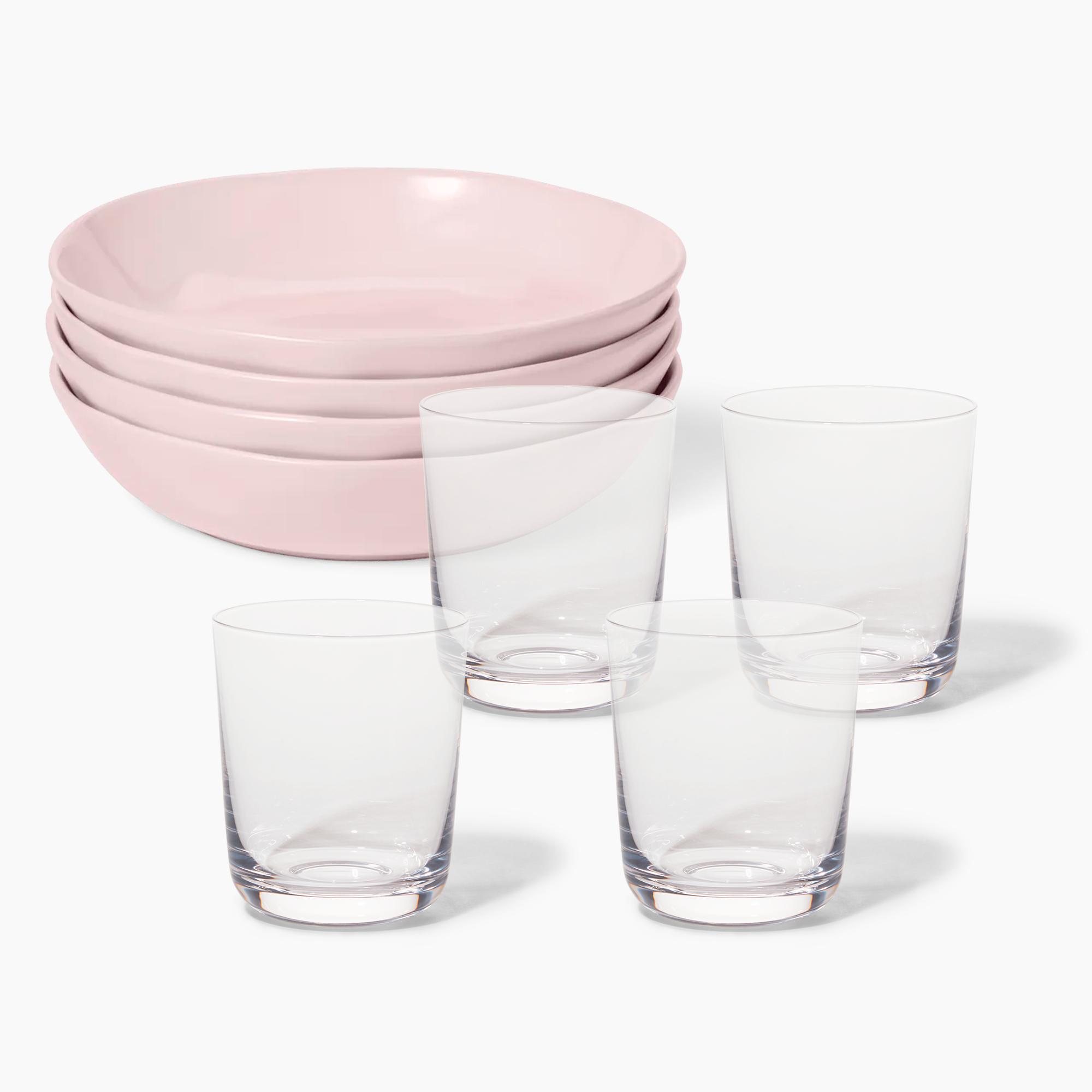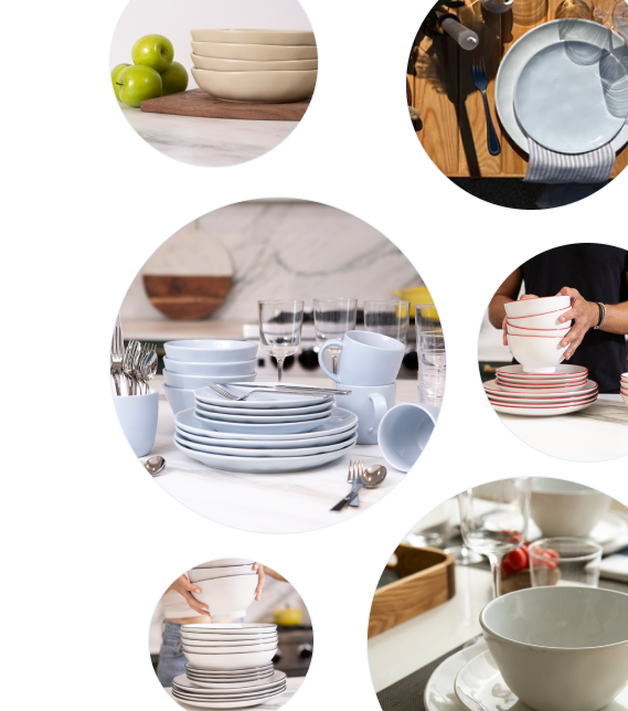A 16-piece set of handcrafted stoneware ceramics, featuring all four core ceramic shapes (big plates, small plates, bowls, mugs). Available in 10 unique colorways.